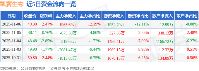 证券之星消息,截至2025年11月6日收盘,凯赛生物(688065)报收于49.3元,上涨2.47%,换手率0.56%,成交量3.29万手,成交额1.61亿元。