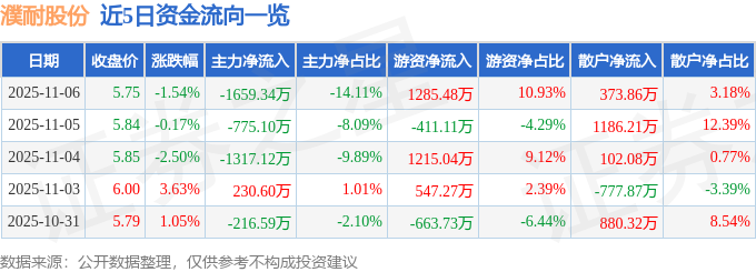 证券之星消息,截至2025年11月6日收盘,濮耐股份(002225)报收于5.75元,下跌1.54%,换手率2.09%,成交量20.41万手,成交额1.18亿元。