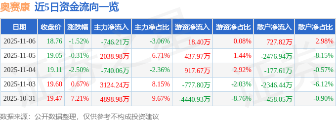 证券之星消息,截至2025年11月6日收盘,奥赛康(002755)报收于18.76元,下跌1.52%,换手率1.41%,成交量13.05万手,成交额2.44亿元。