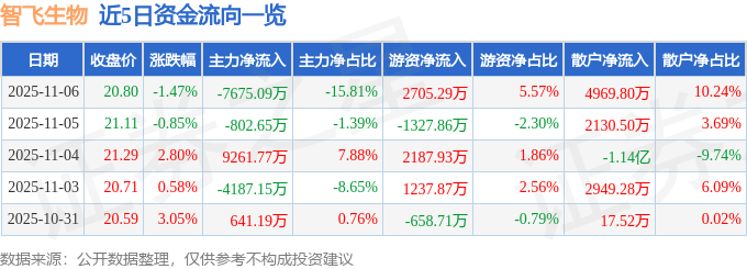 证券之星消息,截至2025年11月6日收盘,智飞生物(300122)报收于20.8元,下跌1.47%,换手率1.64%,成交量23.25万手,成交额4.86亿元。