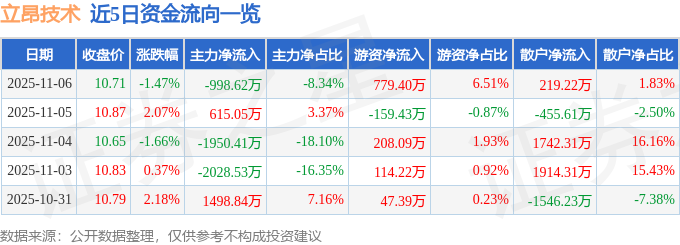证券之星消息,截至2025年11月6日收盘,立昂技术(300603)报收于10.71元,下跌1.47%,换手率3.02%,成交量11.17万手,成交额1.2亿元。