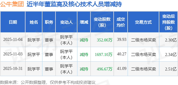 证券之星消息,根据11月6日市场公开信息、上市公司公告及交易所披露数据整理,公牛集团(603195)最新董监高及相关人员股份变动情况:2025年11月3日至2025年11月4日公司董事阮学平共减持公司股份2049.1万股,占公司总股本为1.133%。变动期间公司股价下跌1.67%,11月4日当日收盘报42.94元。