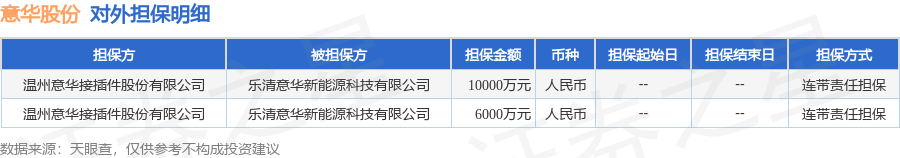 意华股份11月5日披露2笔对外担保,被担保方为乐清意华新能源科技有限公司。对外担保明细如下表: