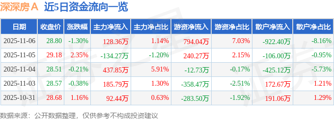 证券之星消息,截至2025年11月6日收盘,深深房A(000029)报收于28.8元,下跌1.3%,换手率0.44%,成交量3.94万手,成交额1.13亿元。