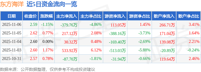 证券之星消息,截至2025年11月6日收盘,东方海洋(002086)报收于2.59元,下跌1.15%,换手率1.91%,成交量30.17万手,成交额7821.91万元。