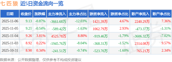 证券之星消息,截至2025年11月6日收盘,七 匹 狼(002029)报收于9.13元,下跌0.87%,换手率5.0%,成交量33.25万手,成交额3.04亿元。
