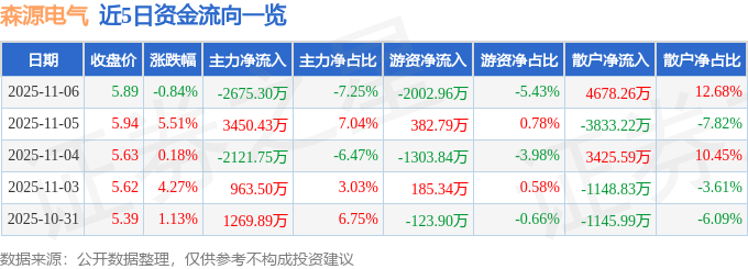 证券之星消息,截至2025年11月6日收盘,森源电气(002358)报收于5.89元,下跌0.84%,换手率6.7%,成交量62.27万手,成交额3.69亿元。