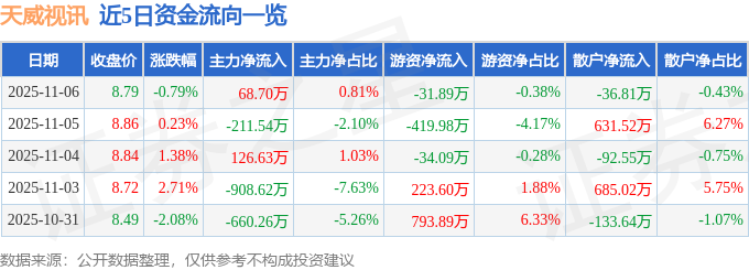 证券之星消息,截至2025年11月6日收盘,天威视讯(002238)报收于8.79元,下跌0.79%,换手率1.21%,成交量9.69万手,成交额8471.99万元。