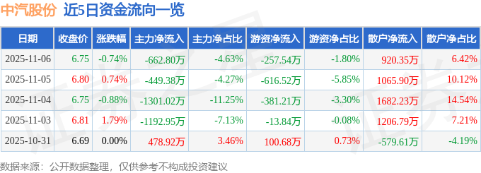 证券之星消息,截至2025年11月6日收盘,中汽股份(301215)报收于6.75元,下跌0.74%,换手率1.59%,成交量21.0万手,成交额1.43亿元。