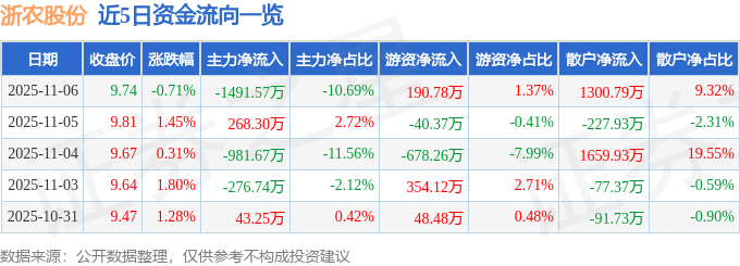 证券之星消息,截至2025年11月6日收盘,浙农股份(002758)报收于9.74元,下跌0.71%,换手率2.74%,成交量14.21万手,成交额1.4亿元。