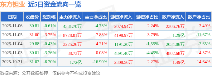 证券之星消息,截至2025年11月6日收盘,东方钽业(000962)报收于30.81元,下跌0.61%,换手率5.96%,成交量29.89万手,成交额9.26亿元。