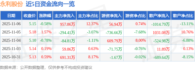 证券之星消息,截至2025年11月6日收盘,永利股份(300230)报收于5.15元,下跌0.58%,换手率2.39%,成交量15.06万手,成交额7742.73万元。
