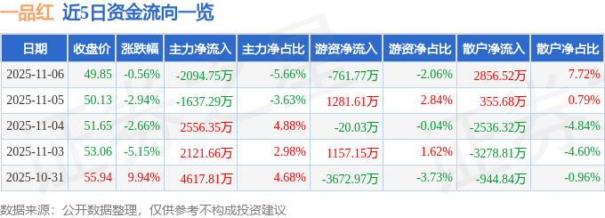 证券之星消息,截至2025年11月6日收盘,一品红(300723)报收于49.85元,下跌0.56%,换手率1.79%,成交量7.47万手,成交额3.7亿元。