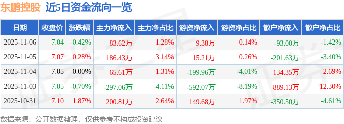 证券之星消息,截至2025年11月6日收盘,东鹏控股(003012)报收于7.04元,下跌0.42%,换手率0.81%,成交量9.3万手,成交额6539.79万元。