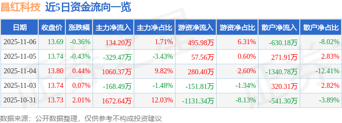 证券之星消息,截至2025年11月6日收盘,昌红科技(300151)报收于13.69元,下跌0.36%,换手率1.55%,成交量5.72万手,成交额7857.15万元。