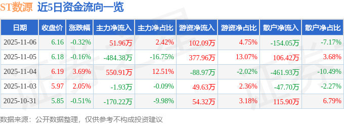证券之星消息,截至2025年11月6日收盘,ST数源(000909)报收于6.16元,下跌0.32%,换手率0.8%,成交量3.5万手,成交额2147.21万元。