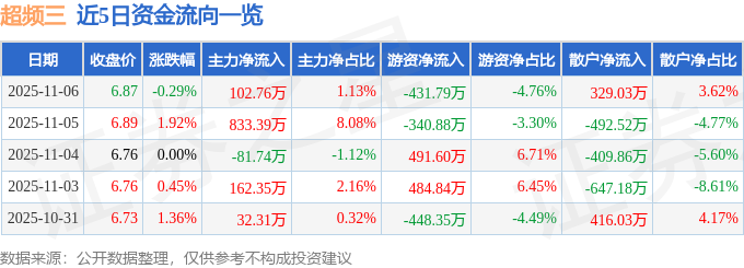 证券之星消息,截至2025年11月6日收盘,超频三(300647)报收于6.87元,下跌0.29%,换手率2.9%,成交量13.26万手,成交额9079.64万元。