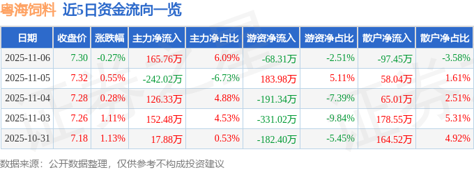 证券之星消息,截至2025年11月6日收盘,粤海饲料(001313)报收于7.3元,下跌0.27%,换手率0.53%,成交量3.74万手,成交额2720.84万元。