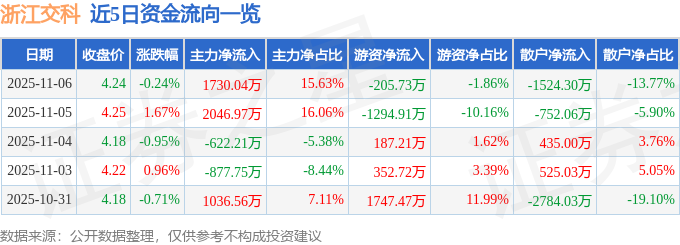 证券之星消息,截至2025年11月6日收盘,浙江交科(002061)报收于4.24元,下跌0.24%,换手率1.0%,成交量26.11万手,成交额1.11亿元。