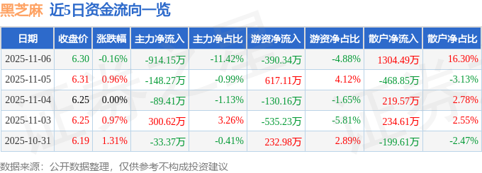 证券之星消息,截至2025年11月6日收盘,黑芝麻(000716)报收于6.3元,下跌0.16%,换手率1.72%,成交量12.72万手,成交额8001.97万元。