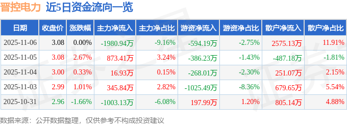 证券之星消息,截至2025年11月6日收盘,晋控电力(000767)报收于3.08元,上涨0.0%,换手率2.4%,成交量69.97万手,成交额2.16亿元。