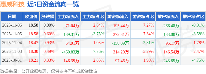 证券之星消息,截至2025年11月6日收盘,惠威科技(002888)报收于18.58元,上涨0.0%,换手率1.94%,成交量1.45万手,成交额2688.54万元。