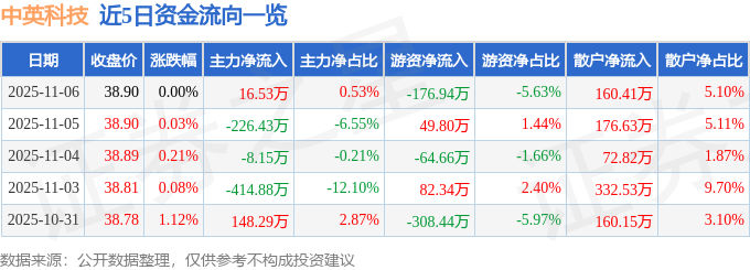 证券之星消息,截至2025年11月6日收盘,中英科技(300936)报收于38.9元,上涨0.0%,换手率1.7%,成交量8079.0手,成交额3144.92万元。
