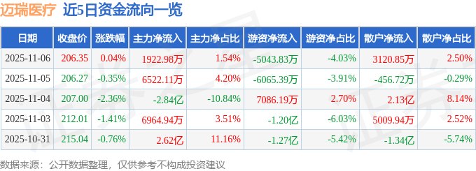 证券之星消息,截至2025年11月6日收盘,迈瑞医疗(300760)报收于206.35元,上涨0.04%,换手率0.5%,成交量6.05万手,成交额12.51亿元。