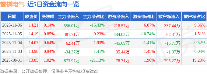 证券之星消息,截至2025年11月6日收盘,雪祺电气(001387)报收于14.21元,上涨0.14%,换手率2.23%,成交量2.54万手,成交额3603.52万元。