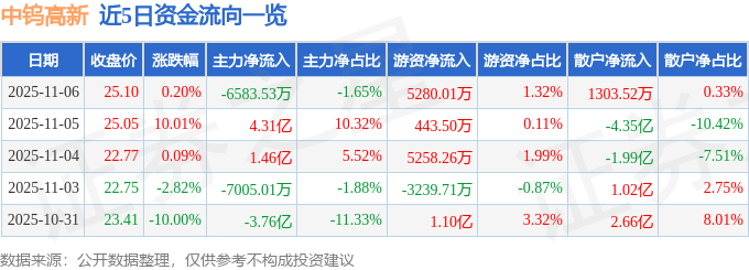 证券之星消息,截至2025年11月6日收盘,中钨高新(000657)报收于25.1元,上涨0.2%,换手率11.06%,成交量159.72万手,成交额39.85亿元。