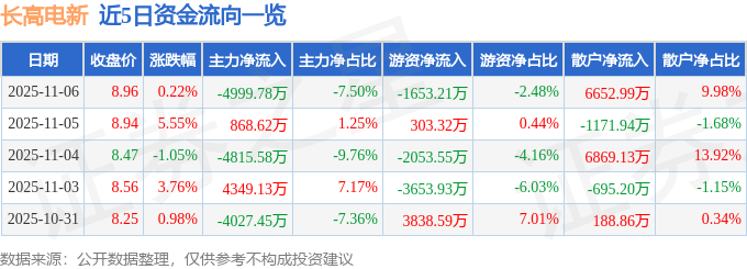 证券之星消息,截至2025年11月6日收盘,长高电新(002452)报收于8.96元,上涨0.22%,换手率14.32%,成交量73.89万手,成交额6.67亿元。