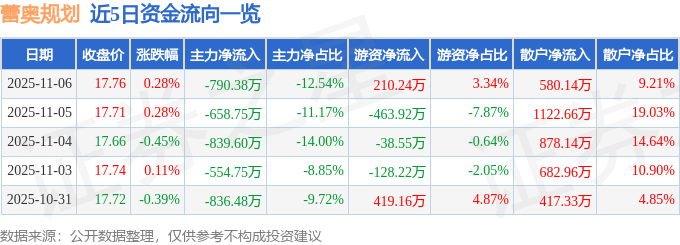 11月6日的资金流向数据方面,主力资金净流出790.38万元,占总成交额12.54%,游资资金净流入210.24万元,占总成交额3.34%,散户资金净流入580.14万元,占总成交额9.21%。