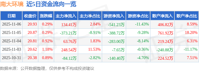 证券之星消息,截至2025年11月6日收盘,南大环境(300864)报收于20.93元,上涨0.29%,换手率1.44%,成交量2.26万手,成交额4736.1万元。