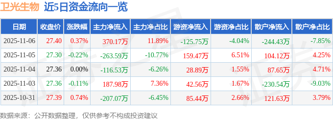 11月6日的资金流向数据方面,主力资金净流入370.17万元,占总成交额11.89%,游资资金净流出125.75万元,占总成交额4.04%,散户资金净流出244.43万元,占总成交额7.85%。