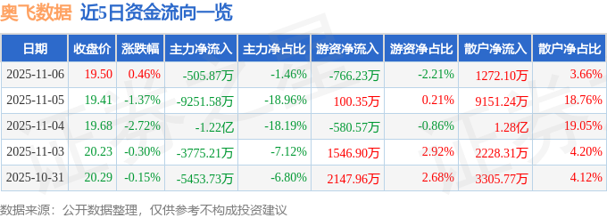 证券之星消息,截至2025年11月6日收盘,奥飞数据(300738)报收于19.5元,上涨0.46%,换手率1.81%,成交量17.85万手,成交额3.47亿元。