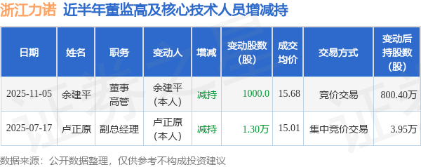 证券之星消息,根据11月6日市场公开信息、上市公司公告及交易所披露数据整理,浙江力诺(300838)最新董监高及相关人员股份变动情况:2025年11月5日公司董事,高管余建平共减持公司股份1000.0股,占公司总股本为0.0007%。变动期间公司股价上涨1.49%,11月5日当日收盘报15.68元。