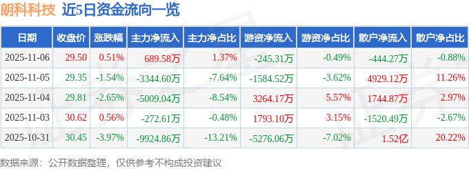 证券之星消息,截至2025年11月6日收盘,朗科科技(300042)报收于29.5元,上涨0.51%,换手率8.52%,成交量17.07万手,成交额5.02亿元。