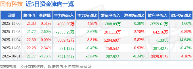 证券之星消息,截至2025年11月6日收盘,同有科技(300302)报收于21.83元,上涨0.51%,换手率10.09%,成交量37.23万手,成交额8.17亿元。