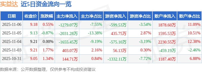 证券之星消息,截至2025年11月6日收盘,实益达(002137)报收于9.18元,上涨0.55%,换手率4.7%,成交量18.63万手,成交额1.69亿元。
