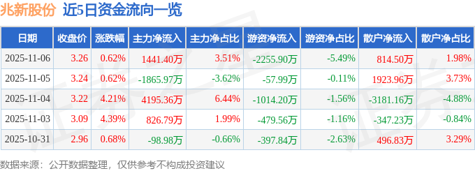 证券之星消息,截至2025年11月6日收盘,兆新股份(002256)报收于3.26元,上涨0.62%,换手率6.5%,成交量126.9万手,成交额4.11亿元。