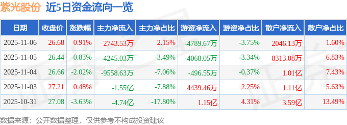 11月6日的资金流向数据方面,主力资金净流入2743.53万元,占总成交额2.15%,游资资金净流出4789.67万元,占总成交额3.75%,散户资金净流入2046.13万元,占总成交额1.6%。