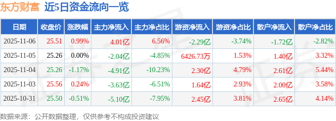 11月6日的资金流向数据方面,主力资金净流入4.01亿元,占总成交额6.56%,游资资金净流出2.29亿元,占总成交额3.74%,散户资金净流出1.72亿元,占总成交额2.82%。