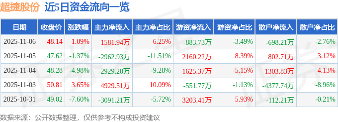 证券之星消息,截至2025年11月6日收盘,超捷股份(301005)报收于48.14元,上涨1.09%,换手率3.99%,成交量5.29万手,成交额2.53亿元。