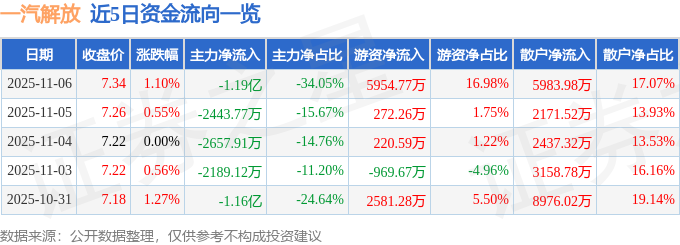 证券之星消息,截至2025年11月6日收盘,一汽解放(000800)报收于7.34元,上涨1.1%,换手率0.97%,成交量47.78万手,成交额3.51亿元。