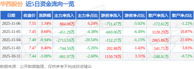 证券之星消息,截至2025年11月6日收盘,华西股份(000936)报收于7.55元,上涨1.34%,换手率2.13%,成交量18.88万手,成交额1.42亿元。