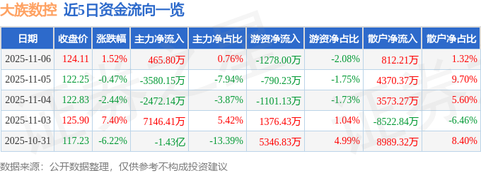 11月6日的资金流向数据方面,主力资金净流入465.8万元,占总成交额0.76%,游资资金净流出1278.0万元,占总成交额2.08%,散户资金净流入812.21万元,占总成交额1.32%。
