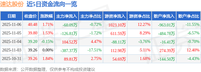 证券之星消息,截至2025年11月6日收盘,速达股份(001277)报收于40.48元,上涨1.71%,换手率4.56%,成交量2.07万手,成交额8337.16万元。