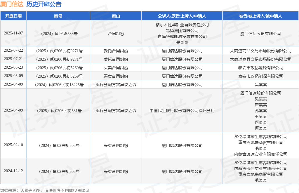 根据统计,近一年内以厦门信达股份有限公司为当事人的历史开庭公告有9则,其中案由为“买卖合同纠纷”的公告以4则居首,其次为“委托合同纠纷”有2则,“执行分配方案异议之诉”有2则。历史开庭公告如下: