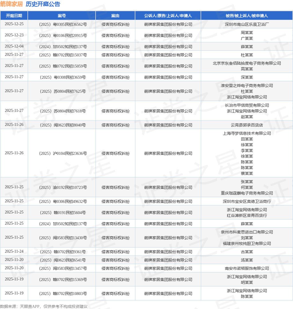 案号:(2025)闽0504民初4595号根据统计,近一年内以箭牌家居集团股份有限公司为当事人的历史开庭公告有508则,其中案由为“侵害商标权纠纷”的公告以442则居首,其次为“商标权权属、侵权纠纷”有22则,“不正当竞争纠纷”有8则。历史开庭公告(前20条)如下: