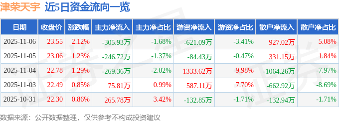 证券之星消息,截至2025年11月6日收盘,津荣天宇(300988)报收于23.55元,上涨2.12%,换手率7.3%,成交量7.78万手,成交额1.82亿元。